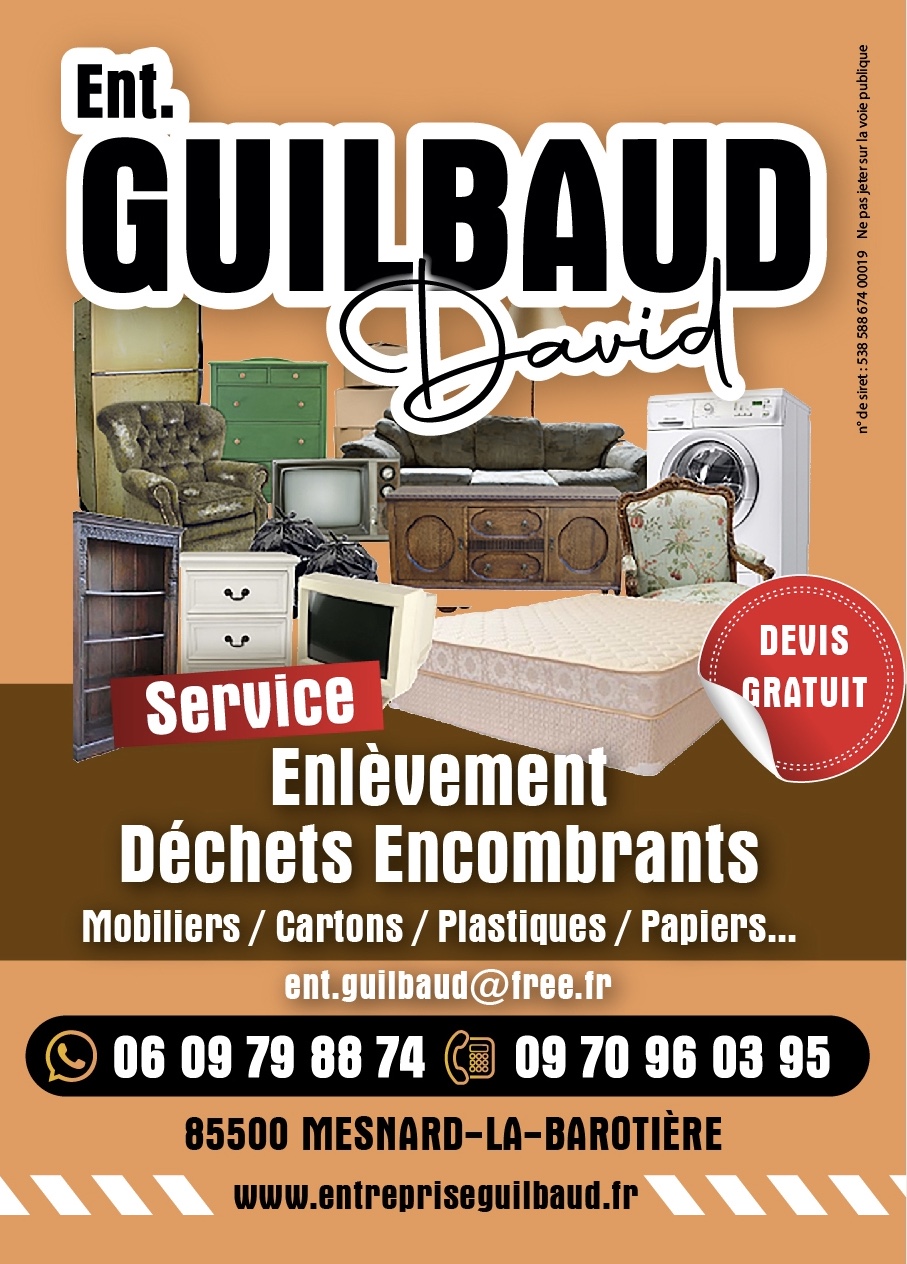 Guilbaud Recyclage est spécialisée dans le débarras de maison, de garage, d’entrepôt et dans l’enlèvement d’encombrants. Nous intervenons dans toute la Vendée, en Loire-Atlantique, notamment à Nantes, ainsi que dans les départements limitrophes. Grâce à un équipement professionnel et une équipe qualifiée, nous vous garantissons un service efficace, rapide et respectueux de l’environnement.
